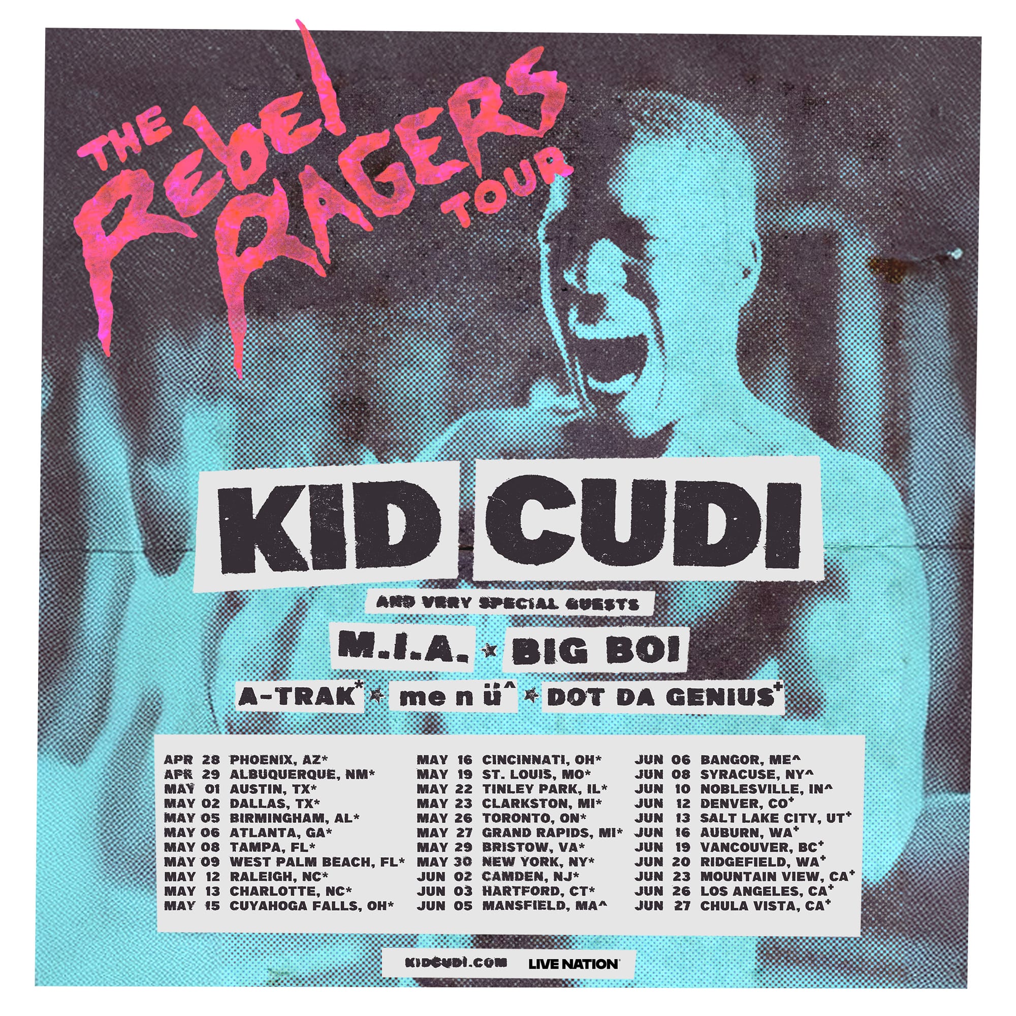 Today, Grammy-Award winning rapper and songwriter Kid Cudi has announced ‘The Rebel Ragers Tour’, hitting over 30 cities in North America featuring special guests M.I.A., Big Boi, A-Trak, me n ü, and Dot Da Genius presents GLKPRTY w/ Powers Pleasanton across select dates. Produced by Live Nation, the tour kicks off on Tuesday, April 28th at Talking Stick Resort Amphitheatre in Phoenix, AZ and continues with stops in Atlanta, Toronto, Los Angeles, New York, and more before wrapping up in Chula Vista, CA at North Island Credit Union Amphitheatre on Saturday, June 27th.